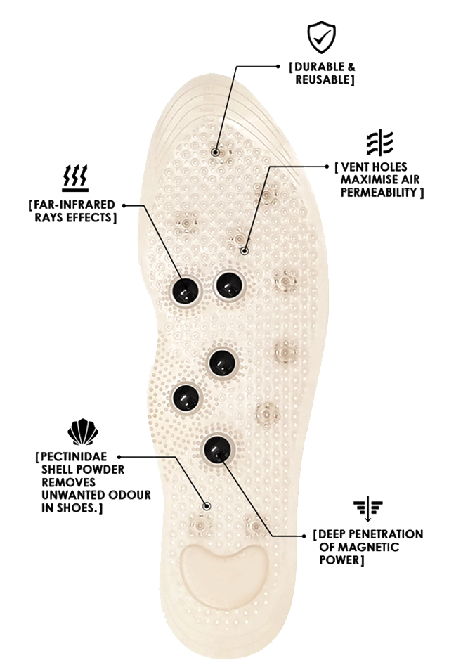 Power Sole is a health sole with a far-infrared magnet with an exclusive patent call MAT Magnet. Power Sole MAT Magnet’s power is ten times higher than the usual magnet, enabling the magnetic field to penetrate 5.5 mm below the skin cells’ epidermis compared to a regular magnet that only goes up to 0.5mm.